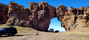 Randonnée de quelques kilomètres dans les montagnes d’Erdene Khairkhan, jusqu’au site de Senjit Khad, une formation rocheuse ressemblant à une arche que l’on retrouve dans les paysages du Far West américain.